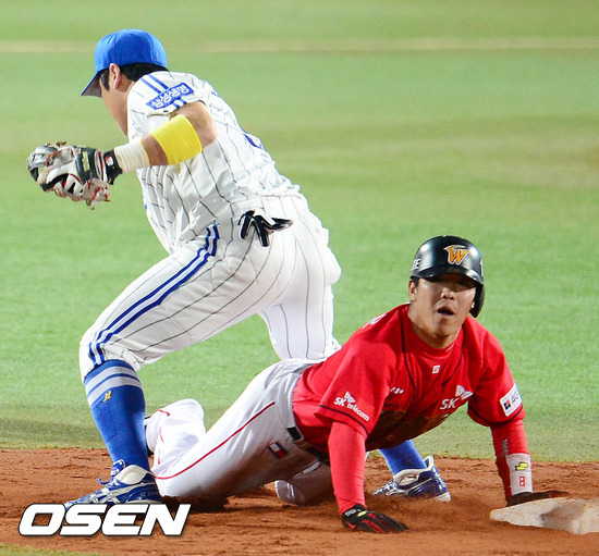 24일 오후 대구구장에서 열린 '2012 팔도 프로야구' 삼성 라이온즈와 SK 와이번스 한국시리즈 1차전 경기 4회초 1사 1루 최정의 타석, 1루주자 정근우의 도루 상황, 포수 이지영의 실책에 공이 빠지고 있다. 정근우는 3루까지 진루.