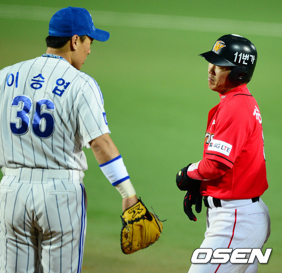 24일 오후 대구구장에서 열린 '2012 팔도 프로야구' 삼성 라이온즈와 SK 와이번스의 한국시리즈 1차전, 4회초 1사에서 SK 정근우가 볼넷으로 진루하고 삼성 1루수 이승엽과 이야기를 나누고 있다