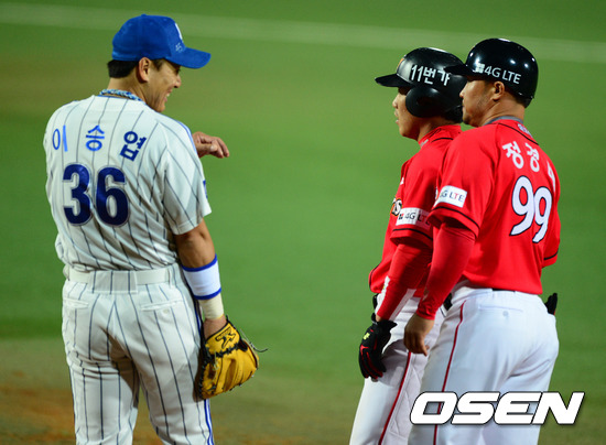 24일 오후 대구구장에서 열린 '2012 팔도 프로야구' 삼성 라이온즈와 SK 와이번스의 한국시리즈 1차전, 4회초 1사에서 볼넷으로 출루한 SK 정근우가 선제 투런포를 날린 삼성 이승엽과 이야기를 나누고 있다
