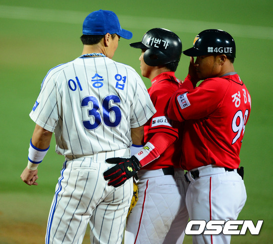 24일 오후 대구구장에서 열린 '2012 팔도 프로야구' 삼성 라이온즈와 SK 와이번스의 한국시리즈 1차전, 4회초 1사에서 볼넷으로 출루한 SK 정근우가 선제 투런포를 날린 삼성 이승엽과 이야기를 나누고 있다