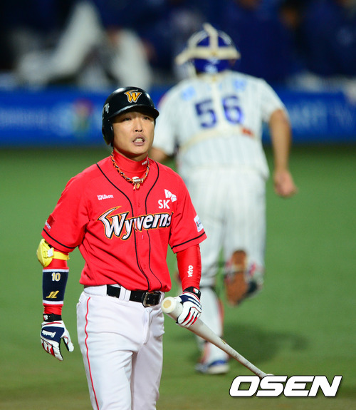 24일 오후 대구구장에서 열린 '2012 팔도 프로야구' 삼성 라이온즈와 SK 와이번스의 한국시리즈 1차전, 5회초 2사 1루에서 SK 조동화가 삼진으로 물러나며 아쉬워하고 있다