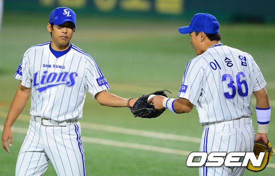 24일 오후 대구구장에서 열린 '2012 팔도 프로야구' 삼성 라이온즈와 SK 와이번스 한국시리즈 1차전, 4회초 2사 3루 SK 최정의 내야플라이를 잡은 삼성 이승엽이 윤성환 투수에게 공을 건네고 있다