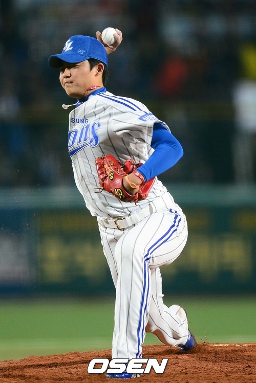 24일 오후 대구구장에서 열린 '2012 팔도 프로야구' 삼성 라이온즈와 SK 와이번스 한국시리즈 1차전 경기, 6회초 1사 2루 최정 타석때 삼성 심창민이 팀 두번째 투수로 등판 공을 뿌리고 있다.