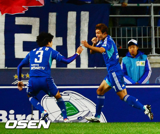 24일 저녁 수원월드컵경기장에서 열린 '현대오일뱅크 K리그 2012' 수원 삼성과 경남 FC 경기에서 전반 수원 조동건이 전반 3분만에 선제골에 성공한 후 기뻐하고 있다.