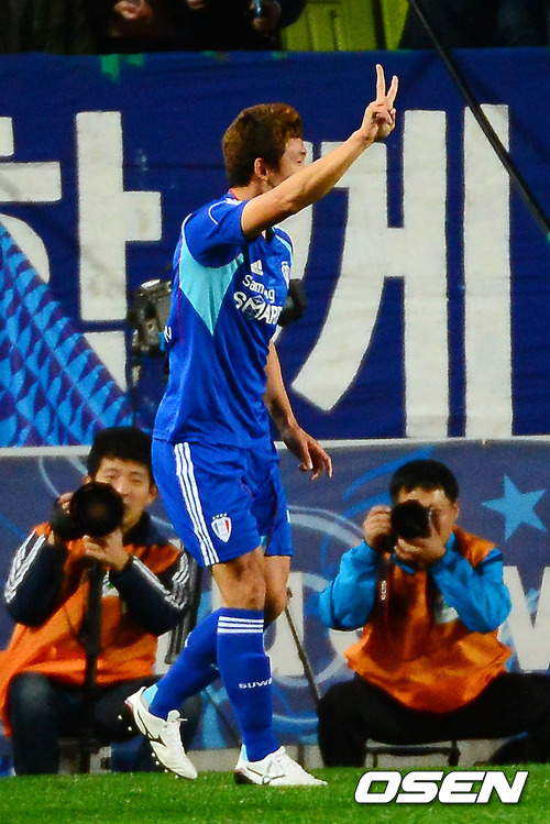 24일 저녁 수원월드컵경기장에서 열린 '현대오일뱅크 K리그 2012' 수원 삼성과 경남 FC 경기에서 전반 수원 조동건이 전반 3분만에 선제골에 성공한 후 전반 7분에 두번째 골에 성공한 후 기뻐하고 있다.