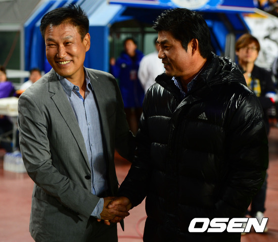24일 저녁 수원월드컵경기장에서 열린 '현대오일뱅크 K리그 2012' 수원 삼성과 경남 FC 경기, 경기 전 경남 최진한 감독과 수원 윤성효 감독이 악수를 나누고 있다.