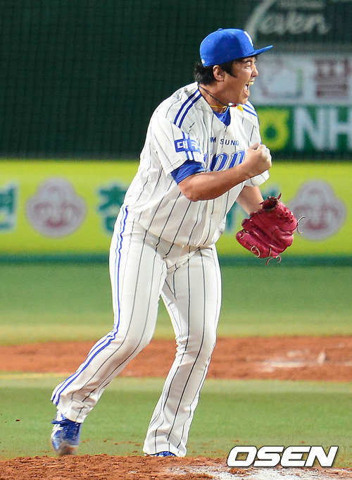 24일 오후 대구구장에서 열린 '2012 팔도 프로야구' 삼성 라이온즈와 SK 와이번스 한국시리즈 1차전 경기 7회초 2사 1루 박진만을 삼진아웃으로 처리한 안지만이 환호하고 있다.