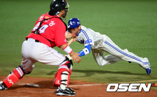 24일 오후 대구구장에서 열린 '2012 팔도 프로야구' 삼성 라이온즈와 SK 와이번스의 한국시리즈 1차전, 7회말 1사 2루에서 삼성 강명구가 배영섭의 적시타에 홈에서 슬라이딩 세이프되고 있다.