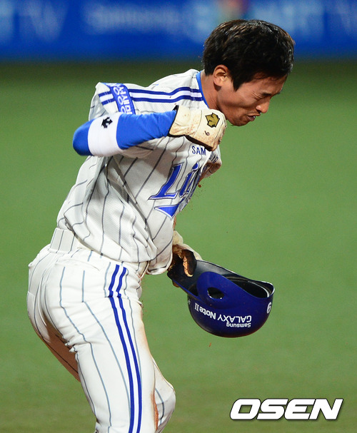 24일 오후 대구구장에서 열린 '2012 팔도 프로야구' 삼성 라이온즈와 SK 와이번스의 한국시리즈 1차전, 7회말 1사 2루에서 삼성 강명구가 배영섭의 적시타에 홈에서 슬라이딩 세이프되고 기뻐하고 있다.