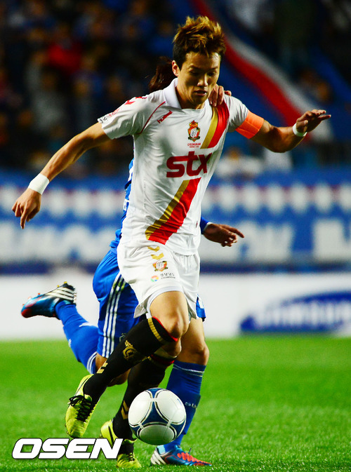 24일 저녁 수원월드컵경기장에서 열린 '현대오일뱅크 K리그 2012' 수원 삼성과 경남 FC 경기에서 전반 경남 강승조가 돌파를 시도하고 있다.