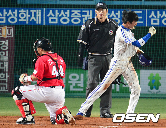 24일 오후 대구구장에서 열린 '2012 팔도 프로야구' 삼성 라이온즈와 SK 와이번스 한국시리즈 1차전 경기 7회말 1사 2루 배영섭의 2루수 왼쪽 내야안타 상황, 2루 대주자 강명구가 홈까지 쇄도해 세이프되자 기뻐하고 있다.