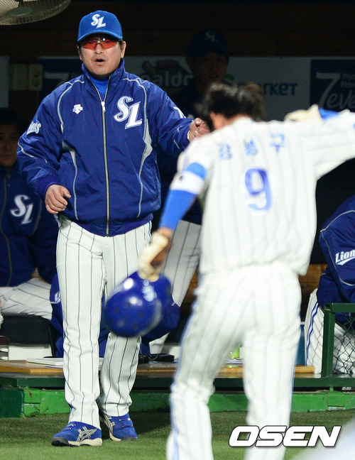 24일 오후 대구구장에서 열린 '2012 팔도 프로야구' 삼성 라이온즈와 SK 와이번스의 한국시리즈 1차전, 7회말 1사 2루에서 삼성 강명구가 배영섭의 적시타에 홈에서 슬라이딩 세이프되자 류중일 감독이 기뻐하고 있다.