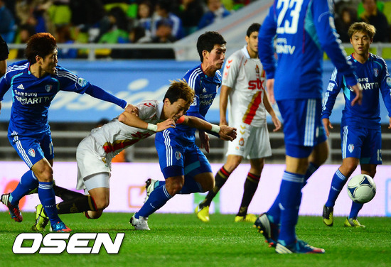 24일 저녁 수원월드컵경기장에서 열린 '현대오일뱅크 K리그 2012' 수원 삼성과 경남 FC 경기에서 전반 경남 강승조가 수비에 걸려 넘어지고 있다.