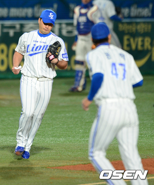 24일 오후 대구구장에서 열린 '2012 팔도 프로야구' 삼성 라이온즈와 SK 와이번스의 한국시리즈 1차전, 8회초 2사 1루에서 삼성 오승환이 권혁에 이어 마운드에 오르고 있다.