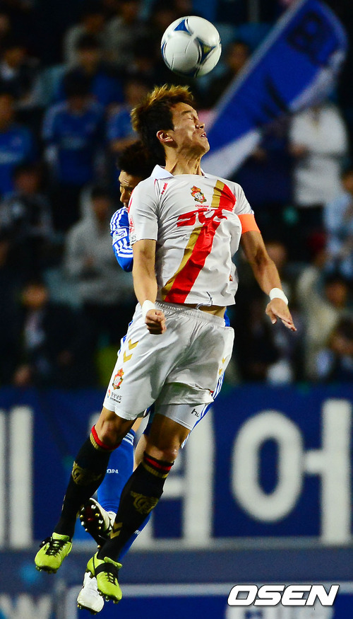 24일 저녁 수원월드컵경기장에서 열린 '현대오일뱅크 K리그 2012' 수원 삼성과 경남 FC 경기에서 전반 경남 강승조와 수원 오범석이 공중볼 다툼을 하고 있다.