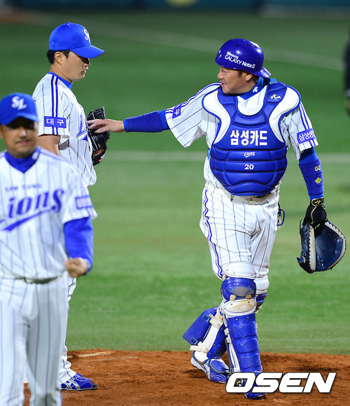 24일 오후 대구구장에서 열린 '2012 팔도 프로야구' 삼성 라이온즈와 SK 와이번스 한국시리즈 1차전,8회초 2사 1루 권혁과 교체된 삼성 오승환이 진갑용과 이야기를 나누고 있다.
