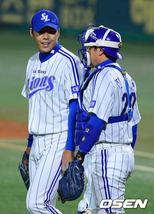 24일 오후 대구구장에서 열린 '2012 팔도 프로야구' 삼성 라이온즈와 SK 와이번스 한국시리즈 1차전,8회초 1사 1루 SK 이재원을 내야플라이 시킨 권혁 투수가 진갑용 포수와 이야기를 나누고 있다