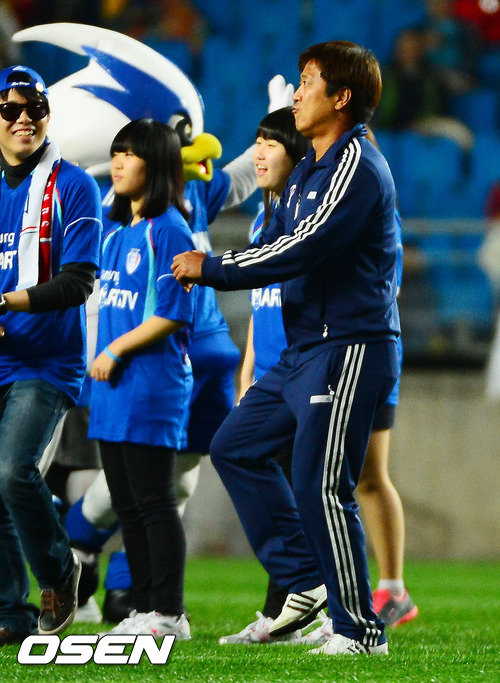 24일 저녁 수원월드컵경기장에서 열린 '현대오일뱅크 K리그 2012' 수원 삼성과 경남 FC 경기에서 하프타임때 수원 고종수 코치가 싸이의 강남스타일에 맞춰 말춤을 추고 있다.