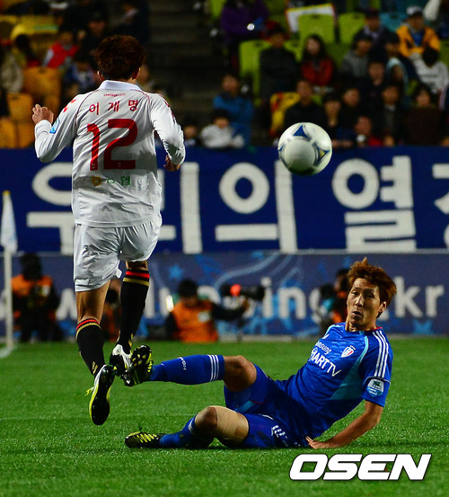 24일 저녁 수원월드컵경기장에서 열린 '현대오일뱅크 K리그 2012' 수원 삼성과 경남 FC 경기에서 후반 수원 곽광선이 경남 이재명에게 태클을 걸고 있다.