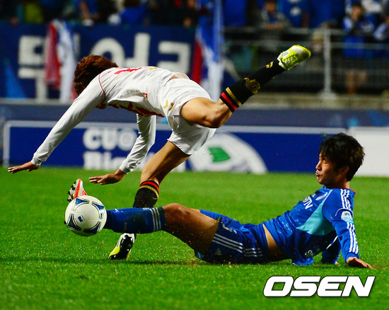 24일 저녁 수원월드컵경기장에서 열린 '현대오일뱅크 K리그 2012' 수원 삼성과 경남 FC 경기에서 후반 수원 박현범이 경남 이재명에게 태클을 시도하고 있다.