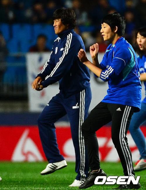24일 저녁 수원월드컵경기장에서 열린 '현대오일뱅크 K리그 2012' 수원 삼성과 경남 FC 경기에서 하프타임때 수원 서정원 코치가 싸이의 강남스타일에 맞춰 말춤을 추고 있다.