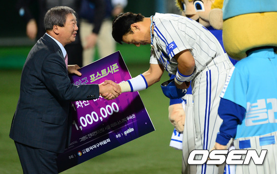 1차전 MVP로 선정된 삼성 이승엽이 KBP 구본능 총재와 악수를 하고 있다./jpnews@osen.co.kr