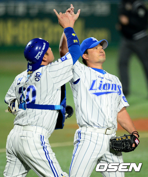 승리한 삼성 진갑용과 오승환이 세리머니를 하고 있다./jpnews@osen.co.kr
