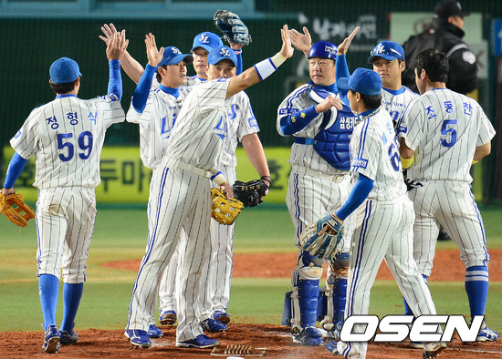 24일 오후 대구구장에서 열리는 '2012 팔도 프로야구' 삼성 라이온즈와 SK 와이번스 한국시리즈 1차전 경기 종료 후 삼성 선수들이 하이파이브를 하고 있다.