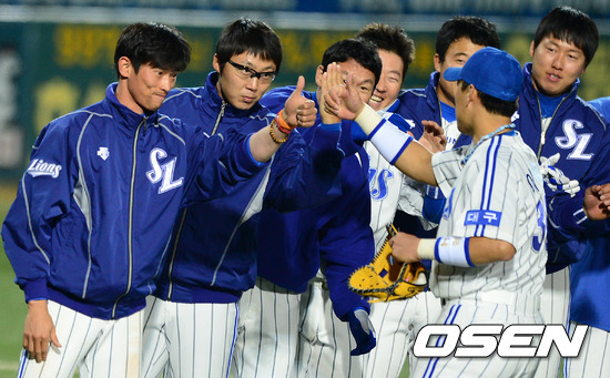 승리한 삼성 선수들이 엄지 세리머니를 하고 있다./jpnews@osen.co.kr