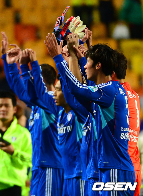 경기를 마치고 수원 선수들이 팬들에게 만세 삼창을 하고 있다. / rumi@osen.co.kr