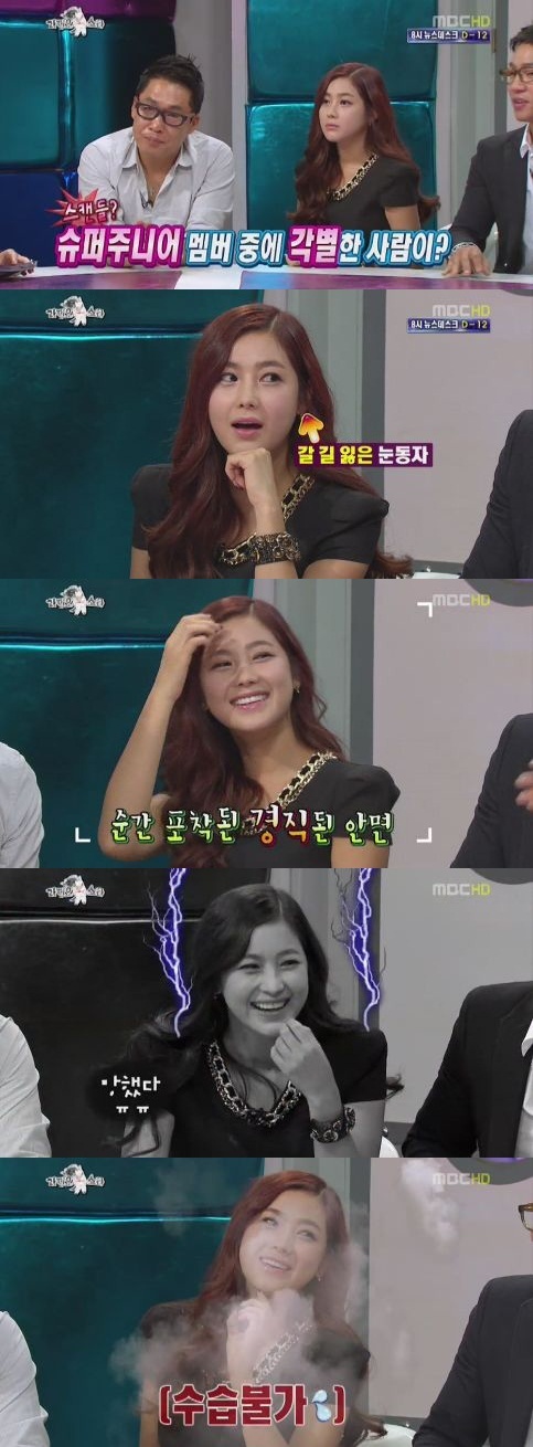 MC 규현이 "슈주 멤버 중에 각별한 사이가 있다고 하는데?"라고 물었다. 이에 솔비는 순간 얼굴이 경직되면서 눈빛이 흔들렸다.