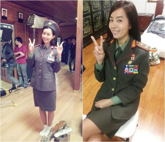 사진 속 김유미는 바쁘게 움직이는 촬영 현장 가운데 북한장교 제복을 입고 환한 미소를 짓고 있다. 김유미는 "짜잔! 북한여자 변신완료. 흰 양말 패션, 죽이죠?"라는 재치 있는 멘트도 덧붙였다.