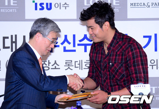 25일 오후 서울 소공동에 위치한 롯데 호텔에서 진행된 '추신수 입국 기자회견 및 롯데호텔 홍보대사 위촉식'에서 추신수가 송용덕 롯데호텔 대표이사에게 위촉패를 전달받고 있다.