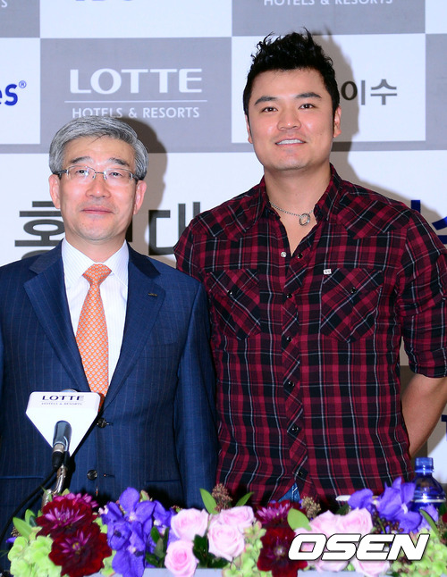 25일 오후 서울 소공동에 위치한 롯데 호텔에서 진행된 '추신수 입국 기자회견 및 롯데호텔 홍보대사 위촉식'에서 추신수가 송용덕 롯데호텔 대표이사와 포토타임을 갖고 있다.