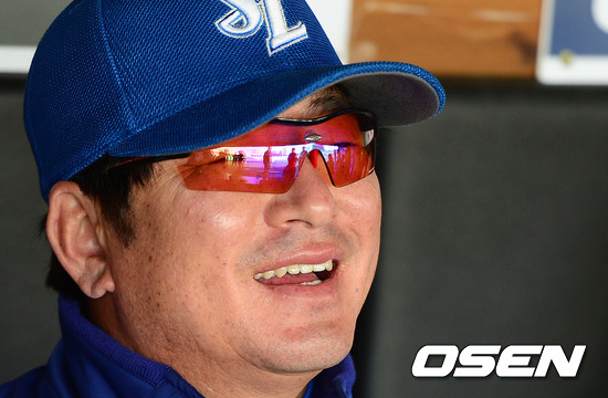 25일 오후 대구구장에서 열린 2012 팔도 프로야구 삼성 라이온즈와 SK 와이번스의 한국시리즈 2차전, 경기에 앞서 삼성 류중일 감독이 취재진과 이야기를 나누며 미소짓고 있다.