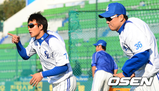 25일 오후 대구구장에서 열린 2012 팔도 프로야구 삼성 라이온즈와 SK 와이번스의 한국시리즈 2차전, 경기에 앞서 삼성 김상수와 이승엽이 러닝을 하며 몸을 풀고 있다.