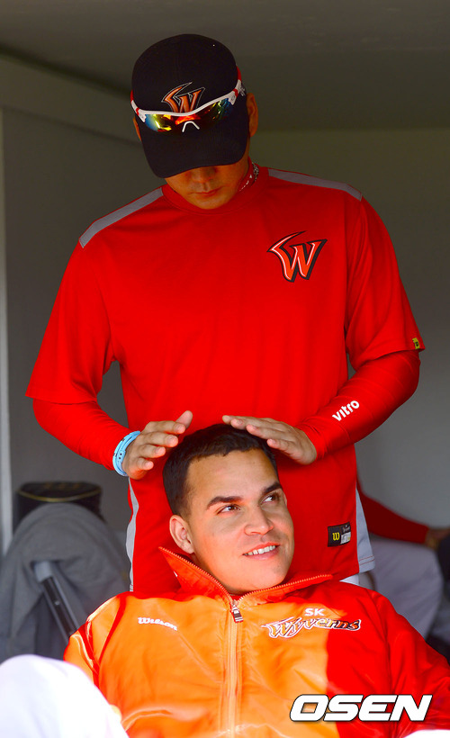 25일 오후 대구구장에서 열리는 2012 팔도 프로야구 대구 라이온즈와 SK 와이번스의 한국시리즈 2차전, 경기에 앞서 선발투수로 나서는 SK 마리오가 박희수의 마사지를 받고 있다.