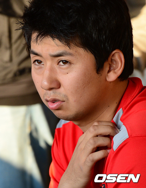 25일 오후 대구구장에서 열린 2012 팔도 프로야구 삼성 라이온즈와 SK 와이번스의 한국시리즈 2차전, 경기에 앞서 SK 윤희상이 더그아웃에서 취재진과 인터뷰를 하고 있다.