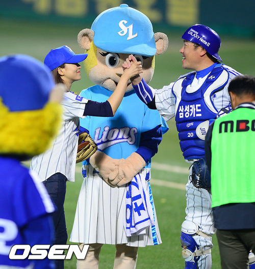 25일 오후 대구구장에서 열린 2012 팔도 프로야구 대구 라이온즈와 SK 와이번스의 한국시리즈 2차전, 경기에 앞서 배우 윤세아가 시구를 마친후 삼성 진갑용 포수와 승리의 세레모니를 하고 있다