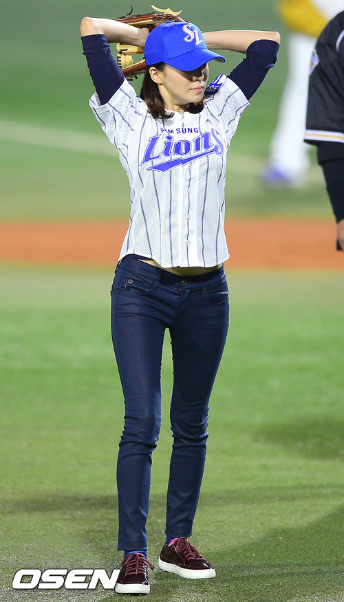25일 오후 대구구장에서 열린 2012 팔도 프로야구 대구 라이온즈와 SK 와이번스의 한국시리즈 2차전, 경기에 앞서 배우 윤세아가 시구를 하고 있다