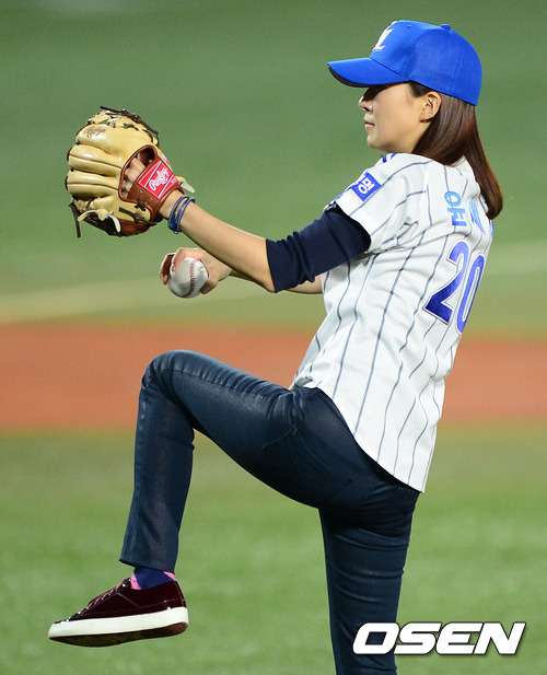 25일 오후 대구구장에서 열린 2012 팔도 프로야구 삼성 라이온즈와 SK 와이번스의 한국시리즈 2차전, 경기에 앞서 배우 윤세아가 시구를 하고 있다.