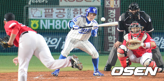 25일 오후 대구구장에서 열린 2012 팔도 프로야구 삼성 라이온즈와 SK 와이번스의 한국시리즈 2차전 경기 1회초 1사 정형식이 기습번트에 실패하고 있다.