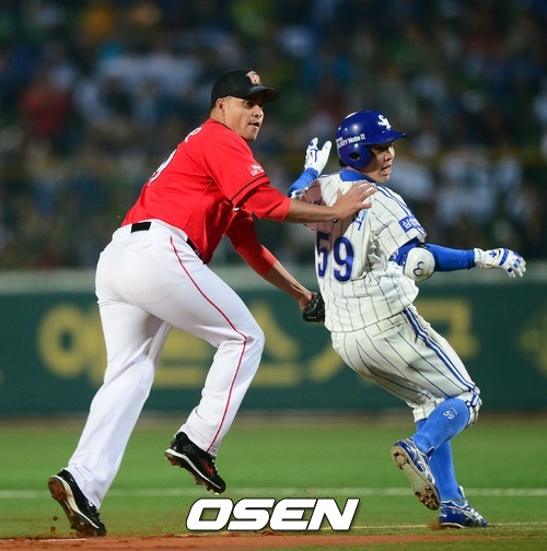 25일 오후 대구구장에서 열린 '2012 팔도 프로야구' 삼성 라이온즈와 SK 와이번스 한국시리즈 2차전 경기, 1회말 1사 정형식 1루수앞 땅볼때 마리오 1루 백업 수비에 들어갔으나 모창민 1루수의 송구실책으로 타자주자를 진루시키고 있다.