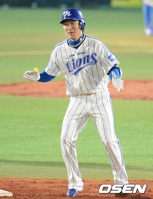25일 오후 대구구장에서 열린 2012 팔도 프로야구 삼성 라이온즈와 SK 와이번스의 한국시리즈 2차전 경기 3회말 1사 2,3루 배영섭이 2타점 2루타를 친 후 기뻐하고 있다.