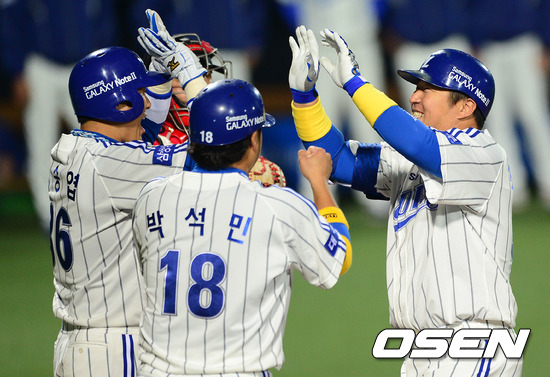 25일 오후 대구구장에서 열린 2012 팔도 프로야구 삼성 라이온즈와 SK 와이번스의 한국시리즈 2차전, 3회말 2사만루에서 삼성 최형우가 만루홈런을 날리고 기뻐하고 있다