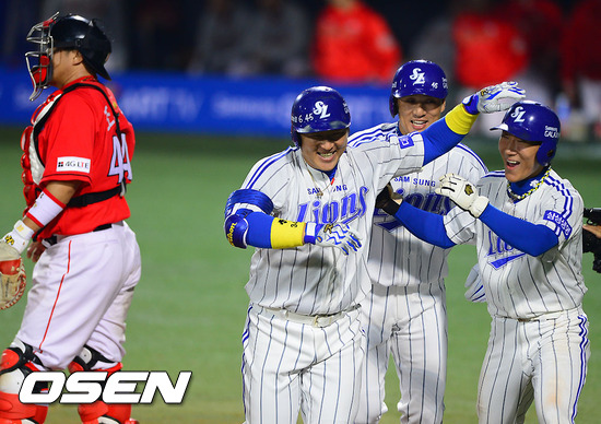 25일 오후 대구구장에서 열린 2012 팔도 프로야구 대구 라이온즈와 SK 와이번스의 한국시리즈 2차전, 3회말 2사 만루 삼성 최형우가 만루 홈런을 날린 후 동료들의 축하를 받고 있다.