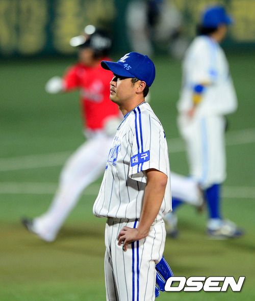 25일 오후 대구구장에서 열린 2012 팔도 프로야구 삼성 라이온즈와 SK 와이번스의 한국시리즈 2차전, 6회초 무사에서 삼성 장원삼이 SK 정근우가 솔로포를 허용하고 아쉬워하고 있다