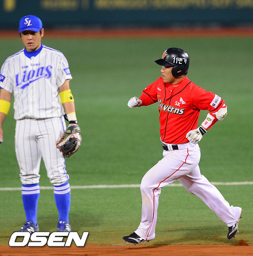 25일 오후 대구구장에서 열린 2012 팔도 프로야구 대구 라이온즈와 SK 와이번스의 한국시리즈 2차전, 6회초 SK 선두타자 정근우가 솔로홈럼을 날린 뒤 베이스를 돌고 있다