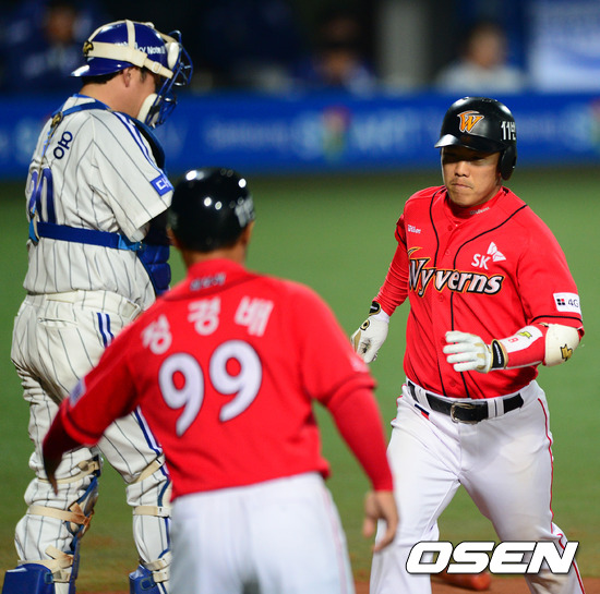 25일 오후 대구구장에서 열린 2012 팔도 프로야구 삼성 라이온즈와 SK 와이번스의 한국시리즈 2차전, 6회초 무사에서 SK 정근우가 솔로포를 날리고 홈을 밟고 있다.