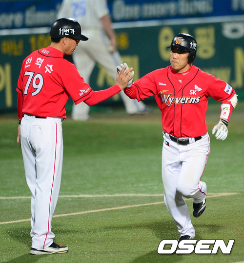 25일 오후 대구구장에서 열린 2012 팔도 프로야구 삼성 라이온즈와 SK 와이번스의 한국시리즈 2차전, 6회초 무사에서 SK 정근우가 솔로포를 날리고 한혁수 코치와 하이파이브를 하고 있다.